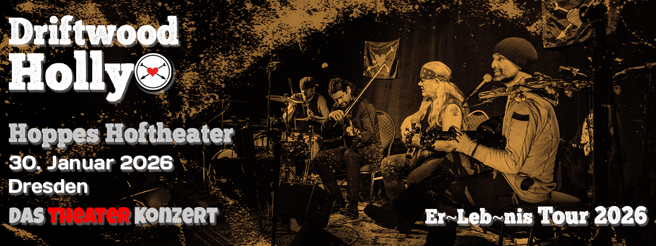 Die Wege von Driftwood Holly in Worte zu fassen ist kaum möglich. Man kann ihn auf seinem Lebensweg gelegentlich und dann meist nur staunend begleiten. Anfang 2026 bietet sich allen wieder die Chance Teil seiner immer unkonventioneller werdenden Er~Leb~nis~Kreationen zu werden, um dabei festzustellen, dass er mit seiner Musik und seinen Geschichten dem Weinfass ganz sicher auch auf dieser Deutschland-Tour den Boden der Realität raushaut. Grenzen waren für den jetzt in Kanada lebenden Ex~Ossi schon immer nur Stolperlinien, aber nie wirkliche Hindernisse.
